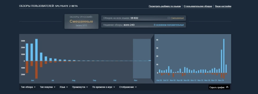 В данный момент обзоры Splitgate 2 в Steam остаются «смешанными». Однако в последние недели число позитивных рецензий превалирует над негативными. Игроки хвалят уникальную и переработанную механику порталов, динамичный геймплей и разнообразные карты. К минусам же относят оптимизацию.