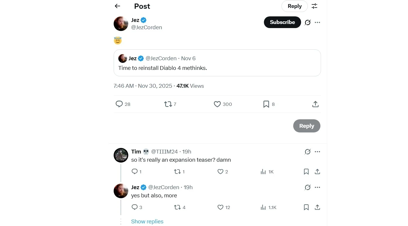 Кстати, ещё в начале ноября Корден написал следующее: «Кажется, пора вновь установить Diablo 4».
