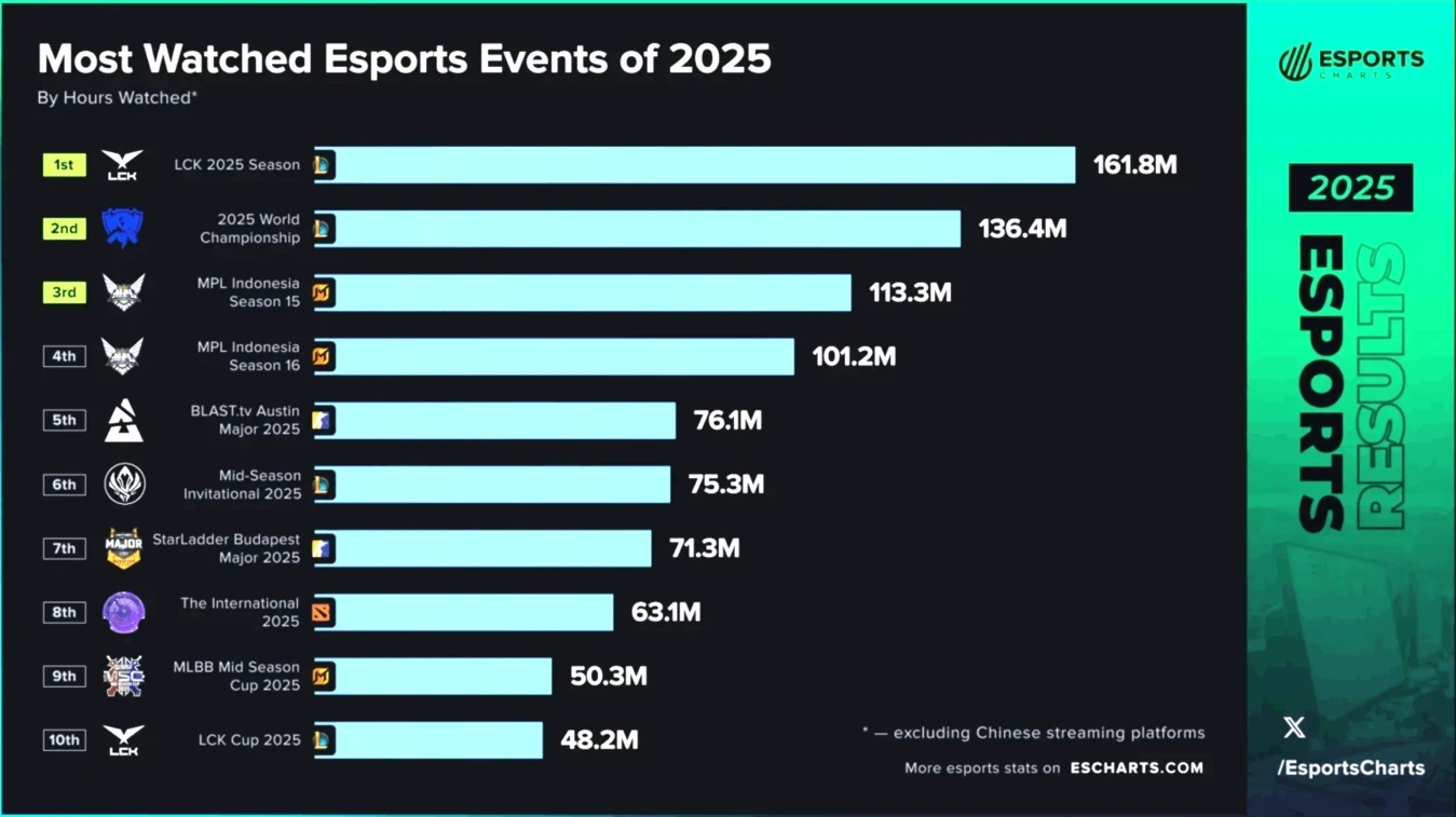 Статистика по просмотрам немного другая, 2025 World Championship отходит на второе место, уступив LCK. В этот топ вошли и турниры по другим дисциплинам: StarLadder Budapest Major, BLAST Austin Major по Counter-Strike 2 и The International по Dota 2.