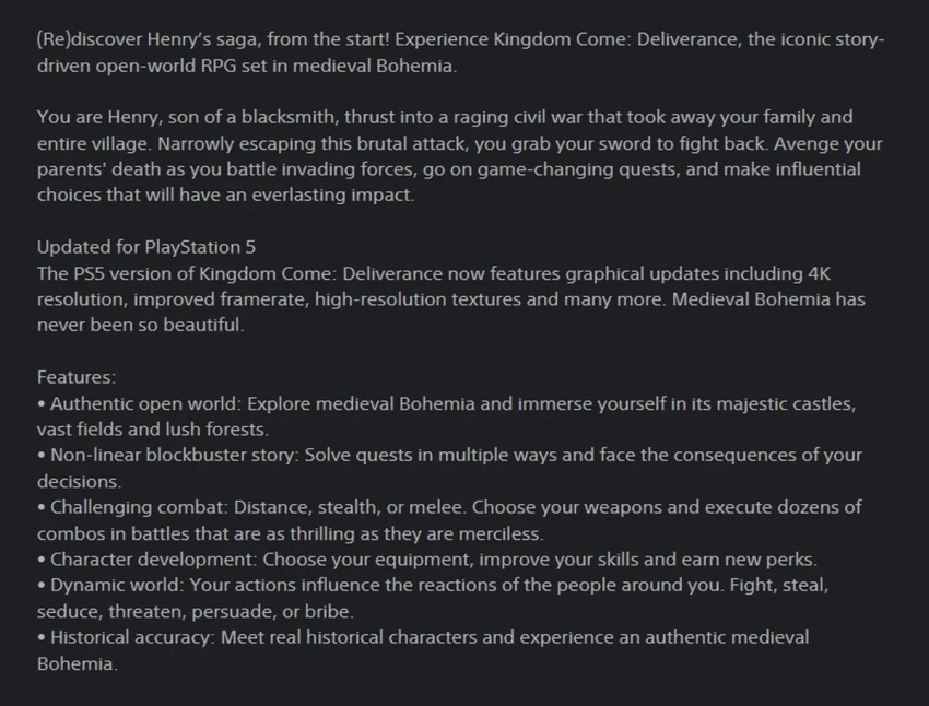Обложка: скриншот Kingdom Come DeliveranceПохоже, что администрация PS Store раньше времени слила информацию о нативной версии Kingdom Come: Deliverance для PS5. Сейчас описание игры подредактировали, но интернет, как известно, помнит всё.