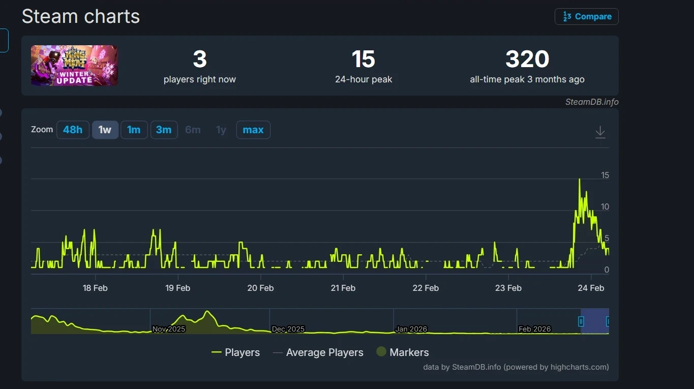 По данным инсайдеров, руководство King of Meat рассчитывало привлечь как минимум 100 тыс. человек. Однако общая аудитория не достигла даже 1 тыс. Пиковый онлайн King of Meat в Steam, к примеру, составил 320 игроков одновременно.