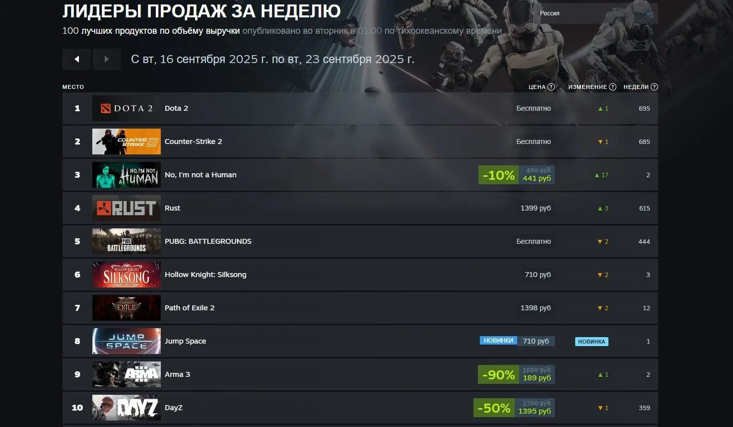 В первую пятёрку также входят Rust и PUBG: Battlegrounds. Hollow Knight: Silksong, который в мировом чарте стоит на 14-й позиции, в России разместился на шестой. Недавно игра получила патч с исправлениями, который добавил размытие. Jump Space в России также выше, чем по миру. Правда, всего на одну строчку.