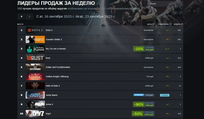 В российском сегменте Steam лидеры другие. Первое место здесь за Dota 2, на второй строчке стоит Counter-Strike 2, а тройку замыкает хоррор No, Iʼm not a Human.